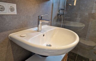 Bei diesem Projekt in einer kleinen Mietwohnung haben wir uns für einen modernen und dennoch zeitlosen Stil entschieden und großformatige graue Fliesen an den Wänden und eine dunkle symmetrische Fliese auf dem Boden verwendet. Um das Gefühl eines größeren Raums zu vermitteln, haben wir in der Dusche lichtdurchlässiges Glas und sowohl für Waschbecken als auch Toilette klassisches Weiß gewählt. So haben wir dieses Mini-Bad in eine stilvolle und komfortable Umgebung verwandelt, unter Berücksichtigung aller Einschränkungen eines alten Gebäudes und einer Mietwohnung.